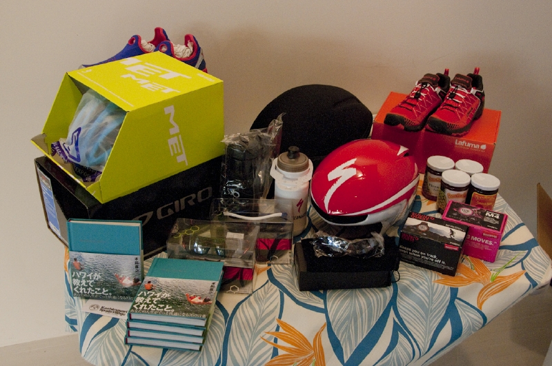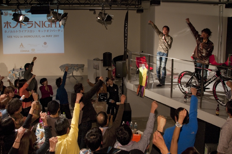 そのほか、ウォッチやサングラス、ヘルメットなどのトライアスロングッズが当たるプレゼント抽選会で会場は大いに盛り上がり、閉会の挨拶には、先日アイアンマンデビューを果たした稲本健一・ゼットン代表取締役が登場(詳細はコチラ:Road to IRONMAN Vol.09・Vol.10)。来場者全員でホノトラに向けて決起。「オー」という掛け声とともに拳を突き上げ、ホノトラへの挑戦を誓った。こうして大盛況のうちにホノトラNIGHTは終了。 ホノトラ開催まであと 3ヶ月と3週間。挑戦者は、"憧れのハワイ"への思いを胸に日々練習に励んでいるだろう。彼らの健闘を祈りたい。