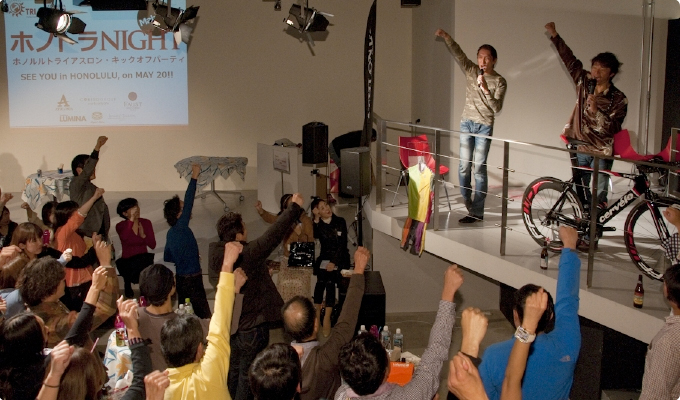 まだまだ寒さが身にしみる2月12日、東京・代官山にあるシアターサイバードはアロハの空気に包まれていた。5月20日開催のホノルルトライアスロ ン(ホノトラ)に向けたキックオフパーティ、「ホノトラNIGHT」がこの日行なわれたのだ。会場には100人を越える挑戦者らが一堂に介し、ホノトラへ の熱い思いを共有した。