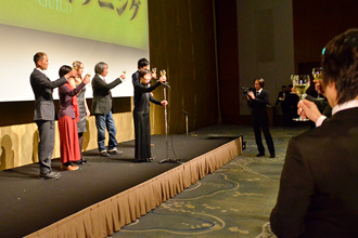 舞台上に各受賞者がズラリと勢ぞろいしたところで、特別賞受賞の田部井氏の発声により乾杯。田部井氏の「この賞が広く知られ、東北が元気になるように」という祈念の言葉に続いて乾杯となり、しばらくの間、歓談・食事の時間が設けられた。