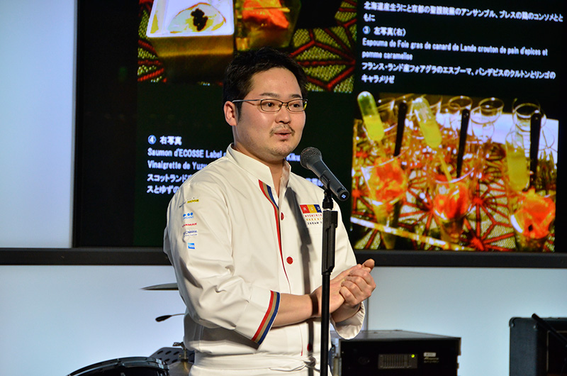 今回のチャリティ・イブニングで提供された4種類の料理は、立食形式へと変更になったのに合わせすべて一口サイズのフィンガーフードとなり、手軽に味わえるように。それらの料理を担当したのが、「RED U-35」でグランプリに輝いた杉本敬三氏である。