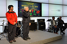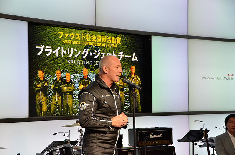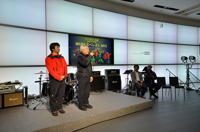 MIURAエベレスト2013の三浦雄一郎、豪太両氏(ファウスト大賞、冒険家賞)、篠宮龍三氏(挑戦者賞)、ブライトリング・ジェットチームのジャック・ボツラン氏(社会貢献活動賞)が司会者の紹介とともに登壇。関野吉晴氏(特別賞)と、森理世氏(ジャストギビング特別賞)はスケジュールの都合で欠席となったが、それでも豪華な顔ぶれが壇上に並んだ。