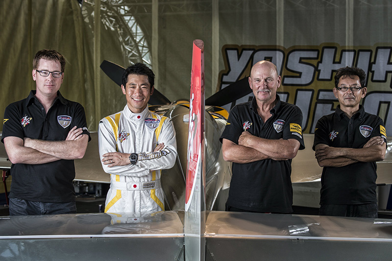 2015 Team Yoshi MUROYA 31。(写真左から)新たに加わったタクティシャン:ベンジャミン・フリーラブ、パイロット:室屋義秀、チーム・コーディネーター:ロバート・フライ、テクニシャン:西村隆。