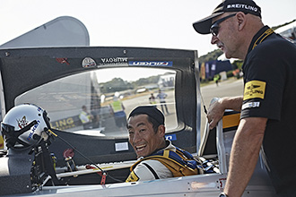 レースを終え、機体から降りると体全体で喜びを表し、チームスタッフと握手を交わした室屋。「機体が速いのは分かっているのに、上へ行けそうで行けない状態だった」ところから、一歩抜け出した瞬間だった。