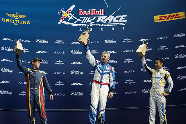 TOP写真:2015アスコット戦で自身2度目の表彰台に。優勝ポール・ボノム、2位マット・ホール、3位室屋義秀。Photo©Joerg Mitter / Red Bull Content Pool