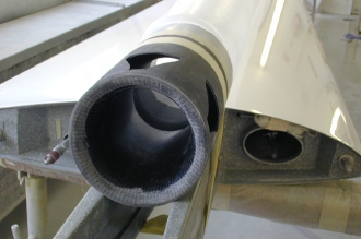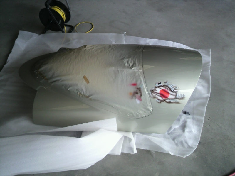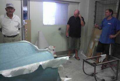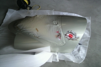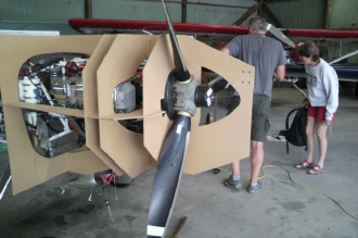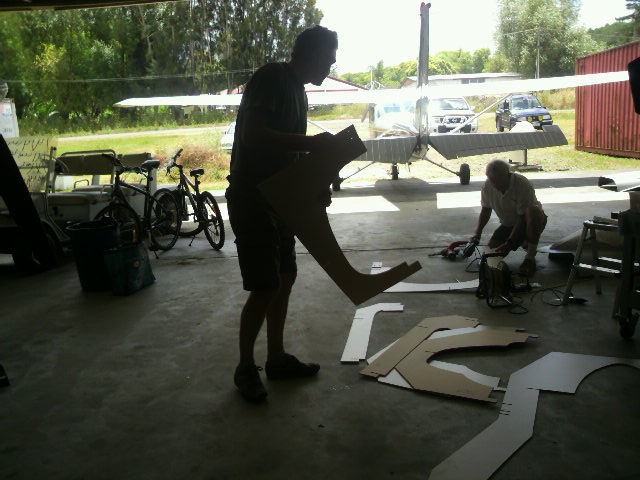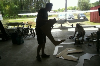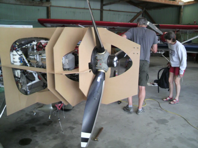 ニュージーランドのハンガー内。新生カウリングの型枠を製作中。