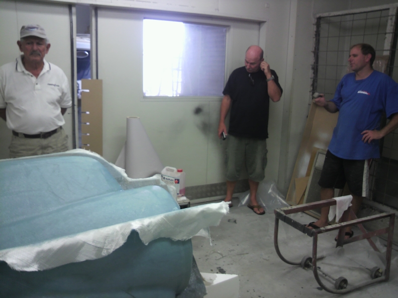 ニュージーランドのボートショップ(!)でカウリングの型を制作してもらった。中央がロバート・フライ。