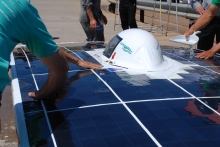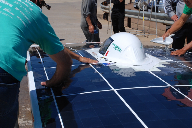 この日の天候は雲ひとつない晴天。風速は約3~4m。チャレンジが行なわれた正午あたりは27℃ほどに達する暑い日だった。発電効率をあげるため、ソーラーパネルの表面温度を冷水で冷やす措置も行なったが、結果には繋がらなかった。