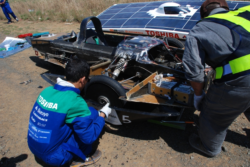 チーム篠塚は、11日間の全日程で規定の走行距離を走破することに見事成功した。しかしそれは簡単な道のりではなかった。まず予想以上に道路のコンディションが悪かったこと。さらに国際大会の中でも特に規定走行距離が長く、険しい山岳路だけでなく、交通量や通行人の多い街中など難易度の高いコースに悩まされた。チームは1日の規定距離を走り切ることを念頭に、ソーラーパワーを有効に使いながら走るエコドライブを敢行。当日朝の充電時間の設定、天候やコースの高低差を考慮しながら走行中の時速調整をするなど、綿密に戦略を立てながら競技に臨んだ。Day7のオウツフルンーイーストロンドン間では、大会中最長の658kmの規定距離 も順調に走破したが、Day8のイーストロンドンーブルームフォンテイン間では、未舗装の砂利道が続くスミスフィールドで、減速運転を強いられたほか、フィニッシュラインまで31kmというところで警察に走行を中止するよう迫られるなどのハプニングがあった(大会運営側は警察にソーラーカーの一般道走行許可願を提出しており、走行中止を命じられた理由は不明)。しかし、これに関しては大会側が不手際を認め、最終日の朝に31kmをリカバーし、その後ゴール地点のプレトリアまでの229kmを走行した。