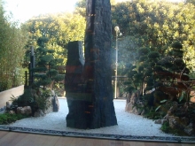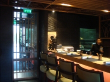 店内には、小さな日本庭園もあり、モナコの海岸沿いにある日本庭園とあわせて、日本文化好きな欧米人からも好評を得ています。極めつけは、カウンターにあるYOSHI特製のBE@BRICK風?人形。トレンディな日本食とコンテンポラリーなアート感覚といった世界から見た日本文化への印象と憧れが垣間見られて面白いです。