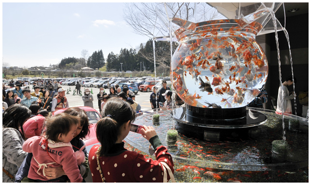気仙沼の人々とのつながりは、昨年3月の東日本大震災をきっかけとする。発災直後に被災地へ物資を届けると、気仙沼から昨夏のアートアクアリウムをわざわざ鑑賞に来てくれた方がいた。そして、口々に東京に来ることができない被災地の人たちにアートアクアリウムを見せてあげたいと言った。この展覧会をそのまま持って行くのは難しい。しかしその声に応えたいと思った木村は大きな決断をした。普段はけっして無料展示はしない代表作の「花魁(おいらん)」を今年3月に気仙沼市内のスーパーマーケットに展示したのだ。