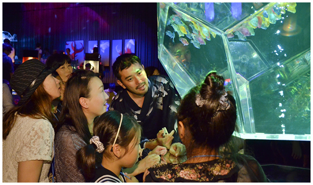 アートアクアリウム展にて気仙沼からのゲストと触れ合う木村(中央)。