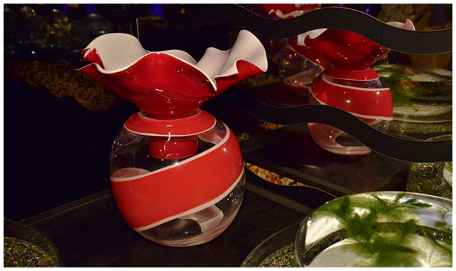 アクリル素材の水槽が基本となっているなかで、ガラス製の金魚鉢で彩られたスペースがあった。ヴェネチアン・ガラスアートの最高峰であるベニーニのコレクションだ。イタリアが誇る世界的ガラス工房から依頼を受け、木村がデザインを手掛けた金魚鉢が並ぶ。