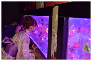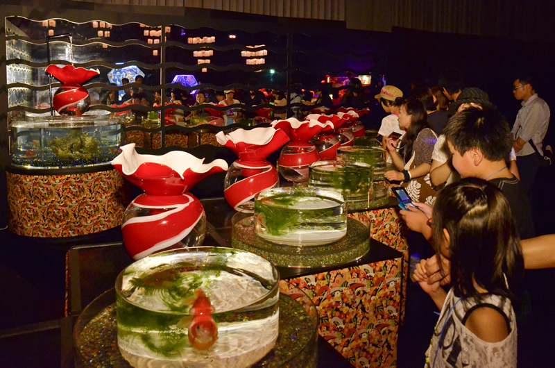 日本橋にちなんで江戸時代の金魚鑑賞文化をイメージした今回の展覧会は、週末は1日に1万人を超える観客を動員した。