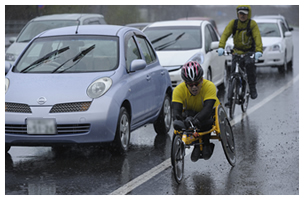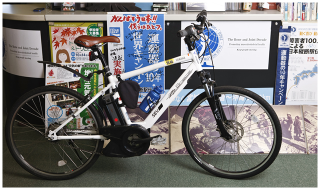 障害者日本縦断駅伝で風間が乗ったヤマハの電動アシスト自転車。ペダルなど左足の後遺障害に対応させてある。