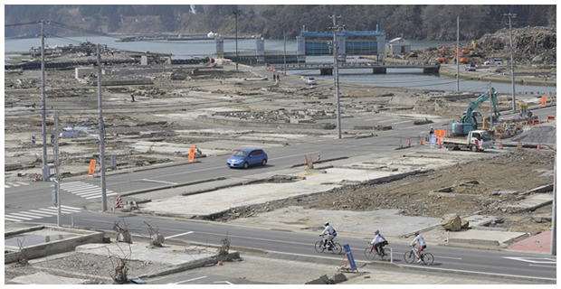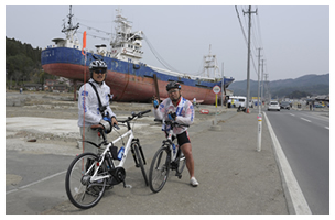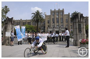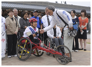 「障害者日本縦断駅伝 完結編」(朝日新聞後援)は2012年4月28日に震災復興支援のため、宮城県庁舎からスタートし、北上。翌日には南三陸町の防災対策庁舎跡をはじめ、被災地を走った(写真)。