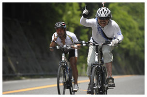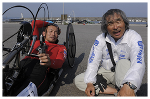 5月28日、大分でシドニーパラリンピック、ハンドサイクル選手の廣道純さんと、くたくたの風間。