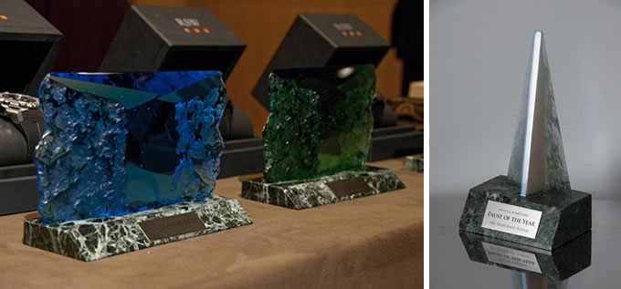 ファウストA.G.アワード2010各賞の授賞記念トロフィーは、昨年に続き、日本を代表するガラス造形作家で国際的に高い評価を得る渋谷良治氏に制作を依頼。渋谷氏の一貫したテーマに「時の堆積」、「自然や宇宙の美と神秘」といったものがあり、作品に見られる人智を超えたものへの憧憬、日本人として地球に生きるものとしての高い意識が、ファウストA.G.の目指す世界観と見事に合致すると考えました。