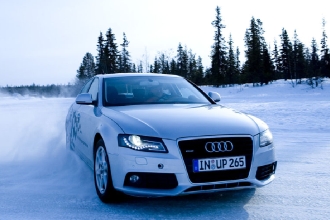 勢い込んでレクチャー室を出たものの、早くも最初の試練が訪れた。ホテルのガレージで、アウディの新型A4に一人ひとり乗り込み、レッスン会場となるサルキロモポロ湖へ向かうのだが、当たり前のように、道路はもれなくアイスバーン。急こう配での一時停止で、早くも1台がエンストの洗礼を受けるはめに……。