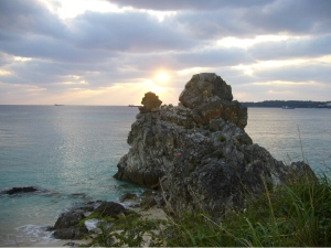 「天気があまり良くないので、残念ながら予定していたポイントに行くことができません。この天気でも潜れるポイントは、崎本部にあるゴリラチョップ(写真を参照)になってしまいます……」