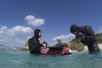 春を思わせる日差しが注いできたところで、いよいよフリーダイビングに挑戦する。シュノーケルとフィンを頼りに深さ4メートルのポイントへ向かい、篠宮が海底にガイドロープを固定した。ガイドロープを手繰って海底まで潜行する。そのときに“耳抜き”をしっかりとやること。それが木村に課せられた最初のミッションだ。