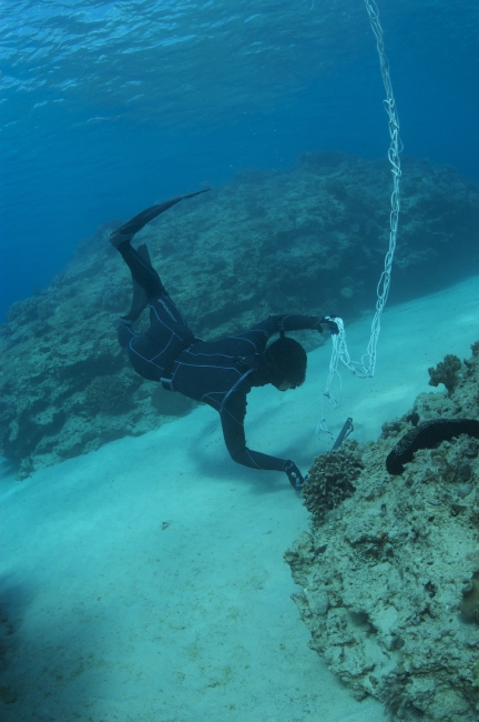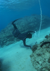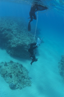 「それでは、ロープをつたわらないで潜ってみましょう」