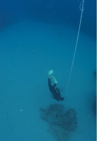 先ほどよりもさらに沖合にポイントをずらし、篠宮がガイドロープを固定する。海底へ潜っていく篠宮の動きはしやかなで淀みがないが、深さが増しているのは明らかだった。午前中に比べると天候が悪く、海中に差す陽光が薄れているように感じる。4メートルよりも、濃い青色がそこにはあった。
