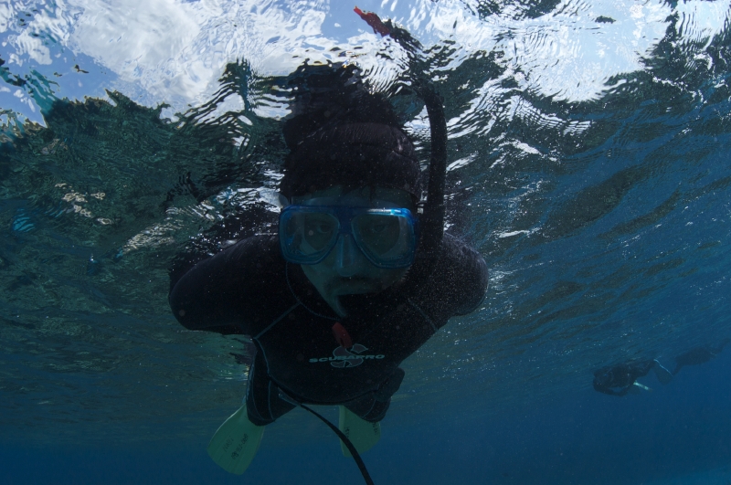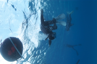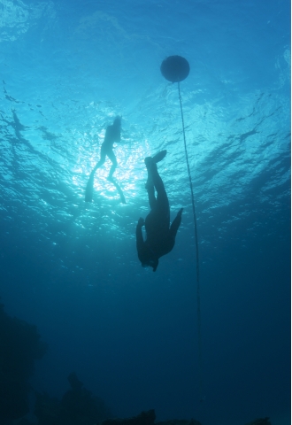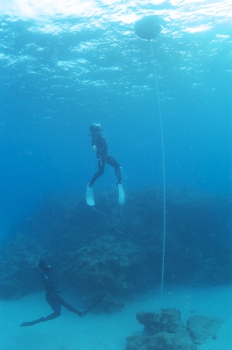 耳抜きを行ないながら潜行していかなければならず、これがビギナーには厄介なのだ。ダイビング初心者のFaustA.G.スタッフのひとりは、2メートルも潜らないうちに耳抜きがうまくいかなくなり、まだ呼吸は苦しくないのに引き返すことになってしまった。