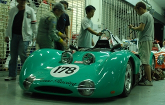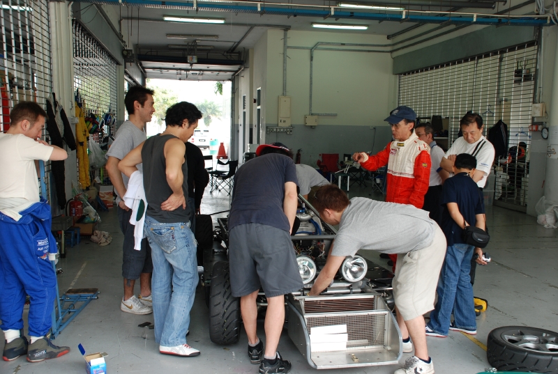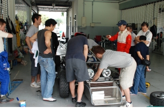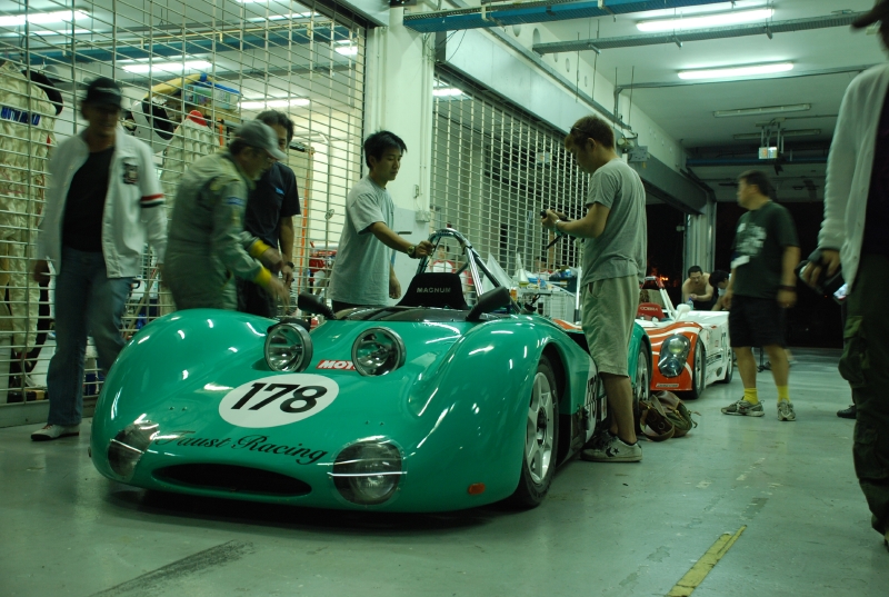 「Faust Racing Team」(ファウスト・レーシングチーム、以下Faust.RT)のドライブする178号車のエメラルドグリーンに塗られたカウルが外され、むき出しにされたマシン後方部。取り外されていくパーツが痛々しい。富士スピードウェイでのシェイクダウンから1週間しか経っていない。出来立てのレーシングカーでの24時間耐久レース、その無茶はわかっていたこと。それでも、セパンで組み直したヒューランドのミッションは、今まで順調に仕事をこなしてきたのだが、クラッチにトラブルが発生したようだ。