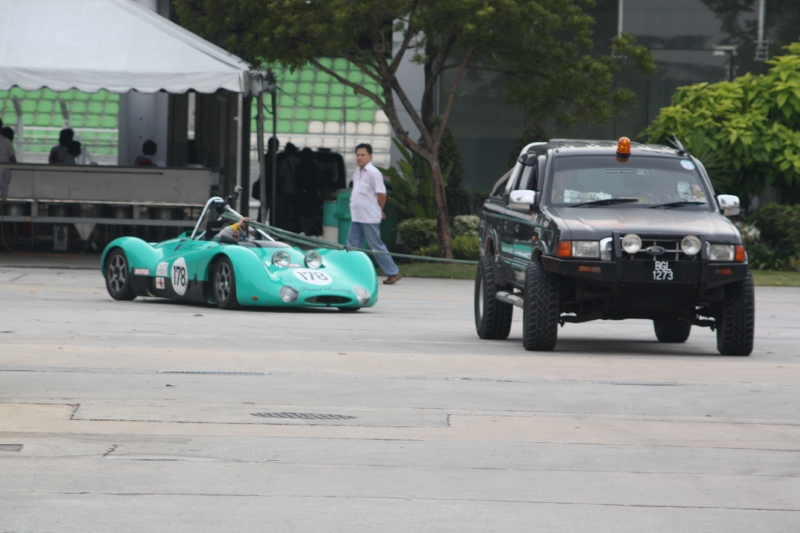ピックアップするマーシャルのトラックがコース上に出るが、ここでも不測の事態が。トラックに、ロールバーに引っ掛ける牽引ロープが積まれていなかったのだ。さらに悪いことに、そのトラックが牽引ロープを取りに戻る途中に、通常フックを使う他のマシンを牽引して帰ってしまったのだ。