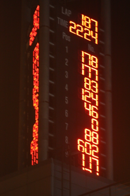 ドライバー達もカメラクルーもすることがない。ピットレーンを横断してコントロールタワーの順位掲示板を見上げる。今までトップを刻んでいた178というオレンジ色の電球が、ひとつ、またひとつと順位を落としていく。そして掲示板から消えた時に、歓喜の宴も、祝杯の夢も、セパンの夜空へと飛び散った。