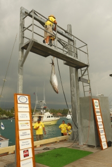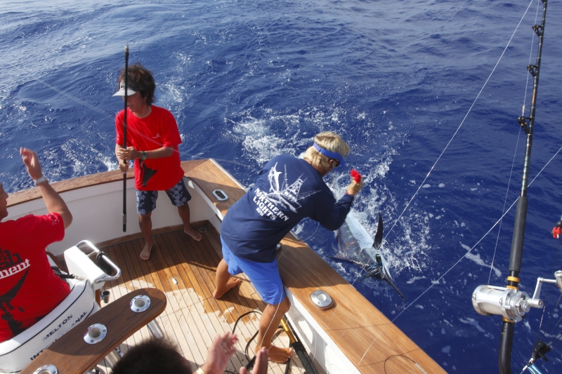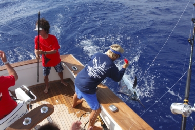 F:それはもう。歴史は長いし、ビル・フィッシャーにとっては憧れのトーナメントですから。いつかは自分のチームを率いて出場したいというのがカジキ釣り始めて以来の夢でした。それが去年、偶然ヒルトン・グランドバケーション・チームのメンバー募集を見つけてトントン拍子に話が進んだ。こんなに早く出場できるようになるとは思ってもいなかったので、決まった時には夜も眠れないくらい興奮しちゃいましたよ(笑)。実は、日本でカジキ釣りをする時は、僕はアングラーはやらないんです。自分の船でチームを率いているので、僕はもっぱら操船と司令塔役。それはそれで性分にあっているし好きなんですが、やっぱりビル・フィッシャーとしてはアングラーが一番楽しい。HIBTに参加すればアングラーができるのも大きな魅力でした。