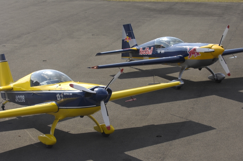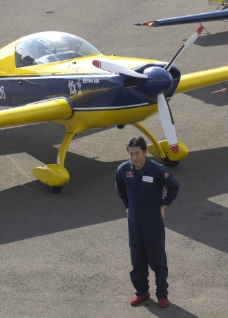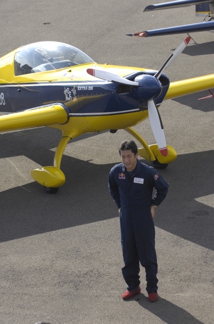 ダークブルーの機体にレッドブルのロゴが眩しいエクストラ300Sが、滑走路に降り立った。プロペラの放つ音が徐々に小さくなり、会員たちの前で機体が止まる。コクピットが開き、室屋がヘルメットを脱ぐ。涼しげな表情(本当にそうなのだ!)でコクピットから出てくる。