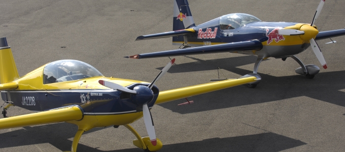 室屋の駆るレッドブル仕様の「エクストラ300S」が、爆音をなびかせながらゆっくりと滑走路へ向かう。ふわりと浮上した機体が、滑らかに上昇していった。澄み切った青空を駆けめぐる機体は、信じられないようなスピードでトリッキーな航路を描き、少し遅れてエンジン音が地上に届く。