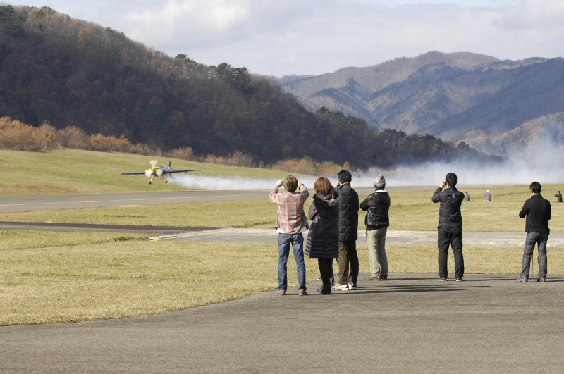 と、いつの間にか地元のギャラリーが集まり、スモークを吐き出しながらの超低空飛行に歓声があがる。室屋が飛行する際は、事前の告知がなくてもエンジン音を聞きつけて自然と地元の人々が集まってくるという。
