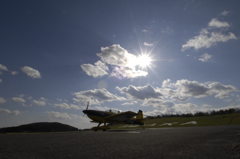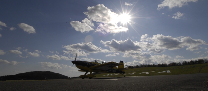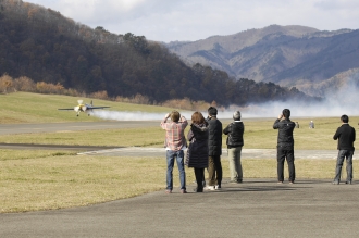 1分ほどのアイドリングののちに、エクストラ200はエプロンからゆっくりと滑走路へ移動していく。ゲストを招き入れた室屋は、いったいどんなフライトをするのか。待機場で待つ会員たちにも緊張が走る。