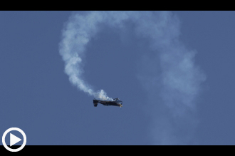 スモークで軌跡を描きながら、予測不能のエアロバティックを披露する室屋機(画像クリックで動画を再生)。