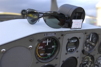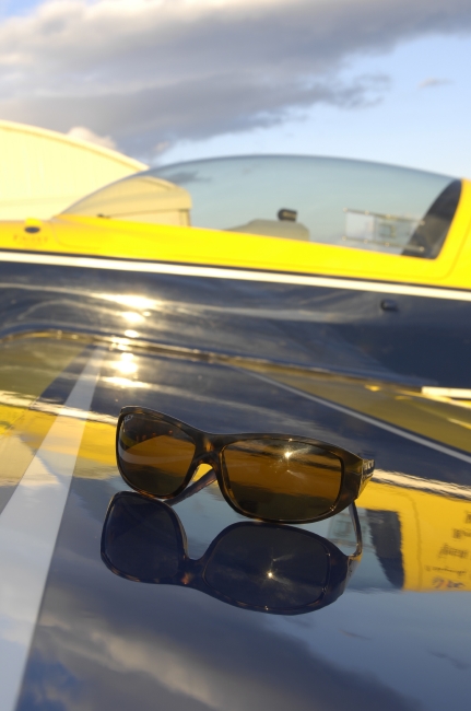 肌寒くも見事に澄み渡った福島の空の下。ファウストたちが装着して飛行体験に臨だのは、ご存知、飛行機と切っても切れないサングラス「レイバン」だ。