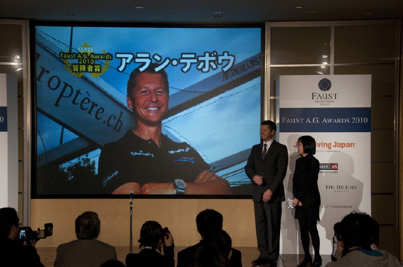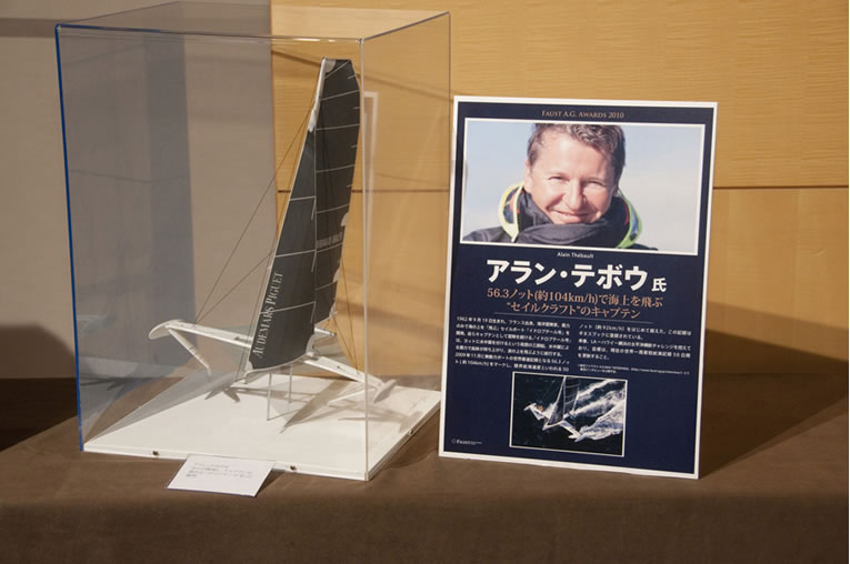 最初に紹介されたのは、アラン・テボウ氏だ。風力のみで海上を飛ぶように駆け抜けるセイルボート「イドロプテール」号を開発し、09年11月に無動力ボートの世界最速記録をマークした彼に、「ファウスト冒険家賞」が贈られたのだ。昨年のイブ・ロッシー氏に続いて、フランス人冒険家が2年連続で同賞を射止めた。