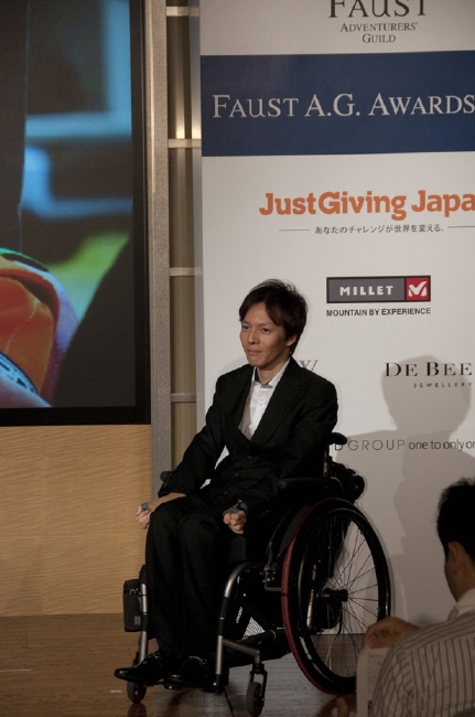 冒険や挑戦と並んで、当アワードでは「貢献」も3大テーマの一つとなっている。3人目に発表された「ファウスト社会貢献活動賞」は、チェアウォーカーの長屋宏和氏に贈られることとなった。