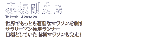 1972年3月6日生まれ、神奈川県出身。会社員。世界で最も過酷な耐久レースのひとつといわれる“極地マラソン”を次々に制覇する市民ランナー。2010年11月の南極マラソン(ラストデザート/7日間250キロ/主催:レーシングザプラネット)に初挑戦、完走を果たしたばかり。 |