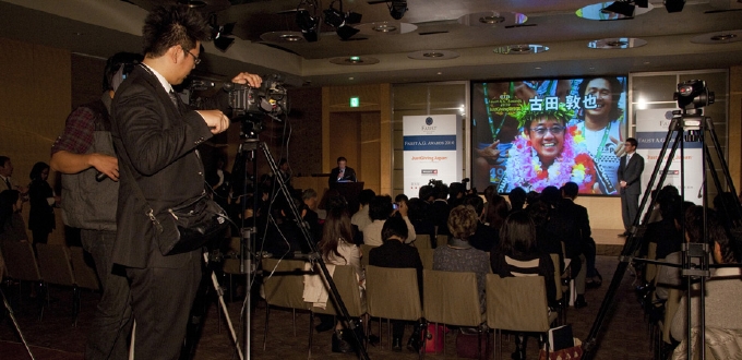 報道関係者のざわめきが静まり、マルチビジョンに視線が集まる。定刻の14時に司会者が開会を告げ、表彰式の幕開けである。
