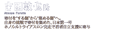 JustGivingは英国発祥のファンドレイジングサイトで、個人の挑戦が寄付につながる仕組みを提供している(紹介記事はコチラ)。古田氏は2010年5月のホノルルトライアスロンへの初出場・完走を、同サイトで掲げることで寄付を募り、目標を超える金額を若者の自立支援を促すNPO法人へ寄付した。