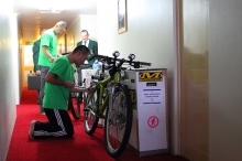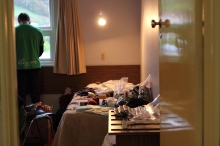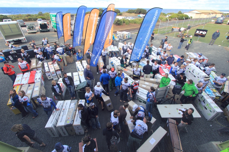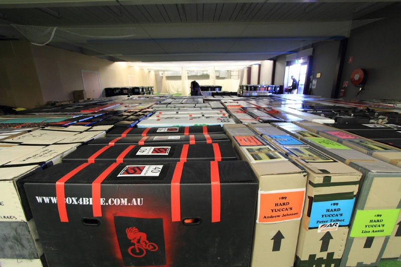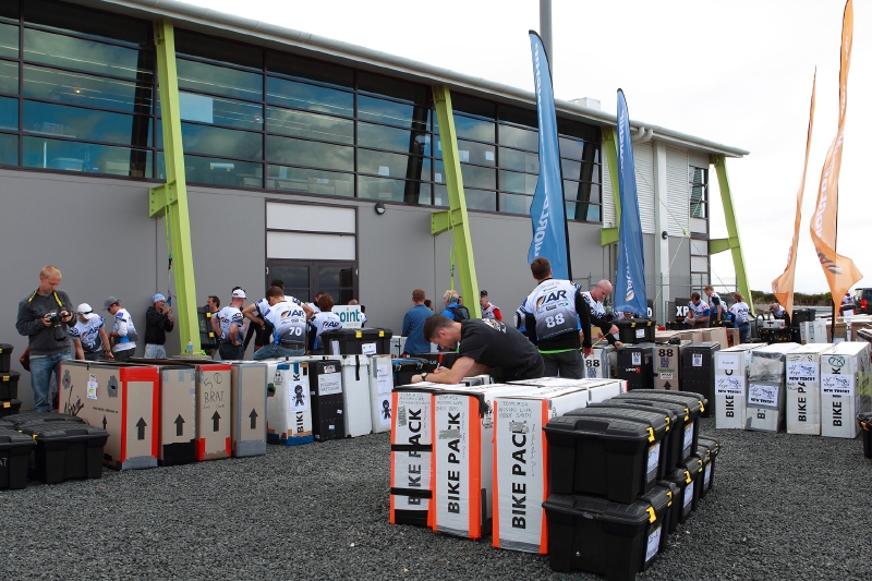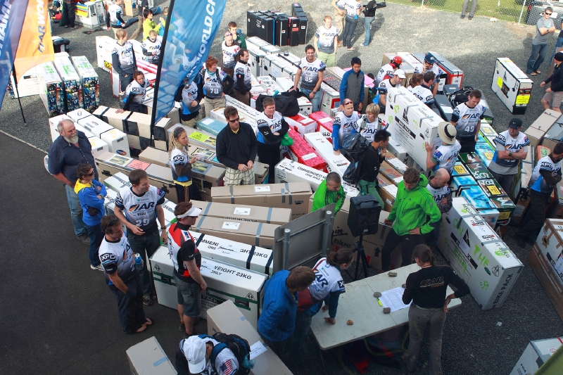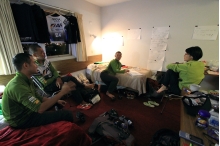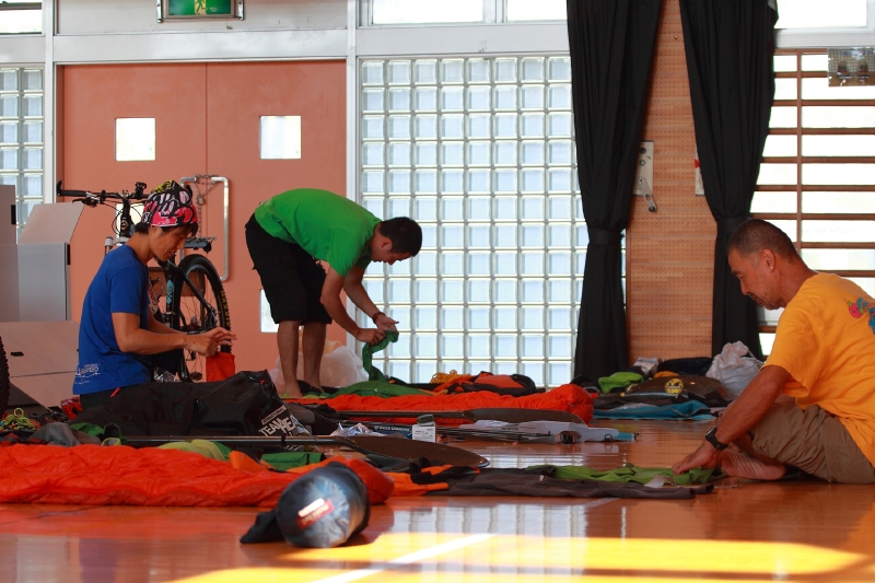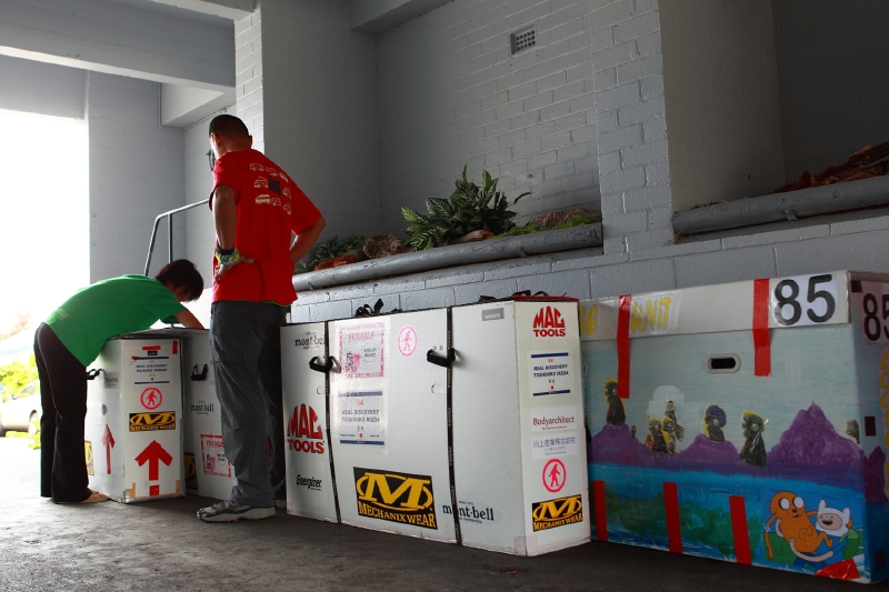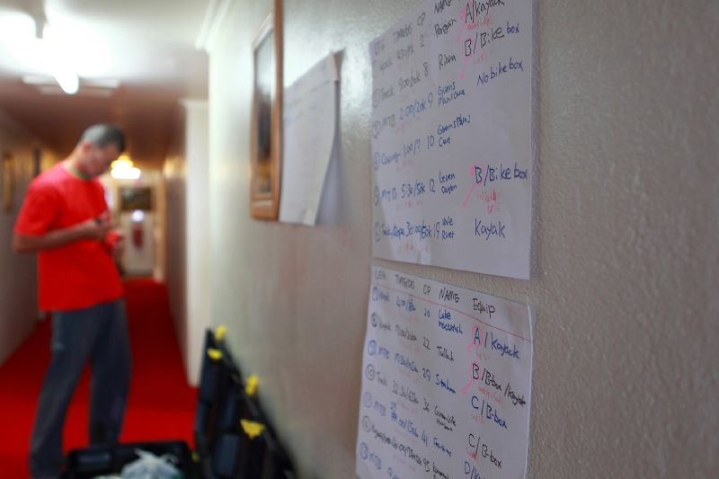 最後の荷物のパッキングだ。何十か所にも及ぶ各トランジションエリアで必要な装備と小分けされた食料を、バイクボックスと5つのトランクに詰めなければならない。数時間後には、大会側の車両がピックアップにくる。一つのトランクには25キロまでしか入れることはできない。もちろん4人分でだ。トランクはトランジションエリア毎に振り分けられるため、間違えは許されない。