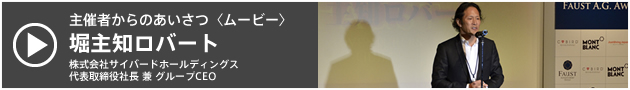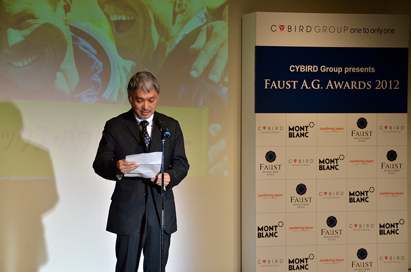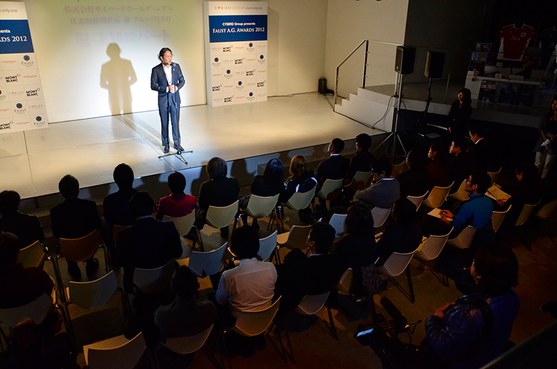 テレビ、新聞、雑誌など、多くの報道関係者が集まり開かれたファウストA.G.アワード2012授賞式は、まず司会進行役より当アワードの主旨説明が行われた後、主催者であるサイバードホールディングスの堀主知ロバートがあいさつ。「サイバードは15年前に設立され、未知の世界だったモバイルインターネットの業界を切り開いてきた会社。同じように『自分たちの人生は自分たちで切り開けるんだ』ということを証明してくれているのが、この方たちだと思う。この賞を通じて、冒険・挑戦・貢献に命をかけている人たちがいることをもっと知ってもらいたい」と述べた。