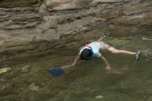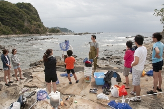 鴨川の隠れスポットまで、磯を歩いて向かう。「去年はもっと波が静かだったね」という声も。準備が整ったら、木村氏から説明と注意を受けて、いざ、海の中へ。