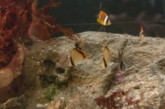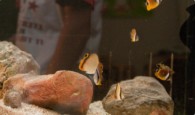 アメフラシやチョウチョウオ、色とりどりの魚たちがアクアリウムの中に入ると、パッと華やいだ海の景色がそこに広がる。