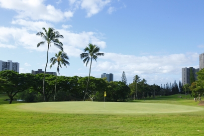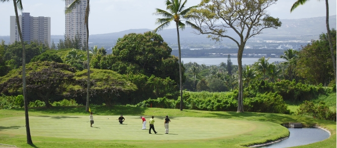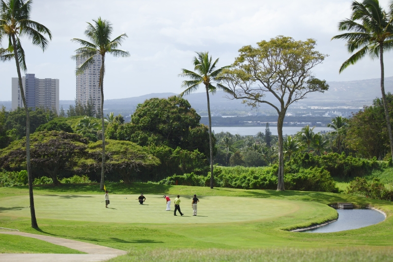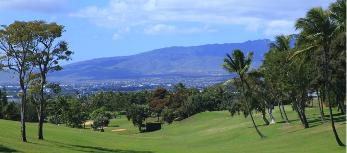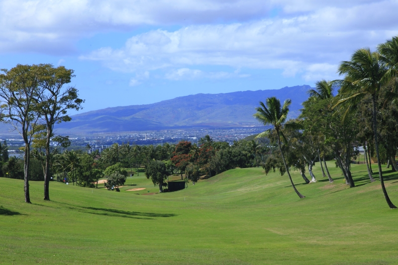 ホノルル空港から車で約20分。目前にパールハーバーが広がり、西側にはワイアナエ山脈が広がる美しいコース。毎年2月に開催される、このパールオープンゴルフトーナメントは、多くのプロ・アマが54ホールに挑戦するハワイで最も権威あるトーナメント。