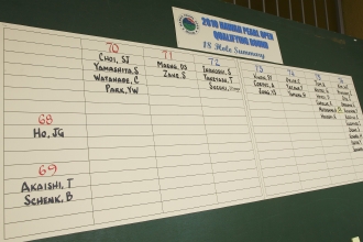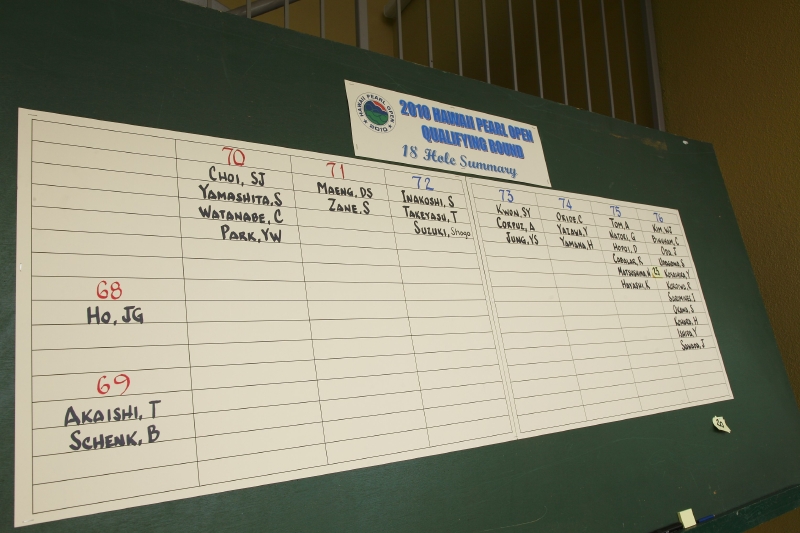 上位者を書き出すスコアボード。「69」の欄に鈴木と一緒に回ったバリー・シェンクの名前が見える。今年の予選は非常にハイレベルとなった。