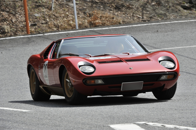 スーパーカークラスの1972年式ランボルギーニ・ミウラSV。4リッターの12気筒エンジンをミッドに横置き搭載。1967年式のP400もエントリーしていた。