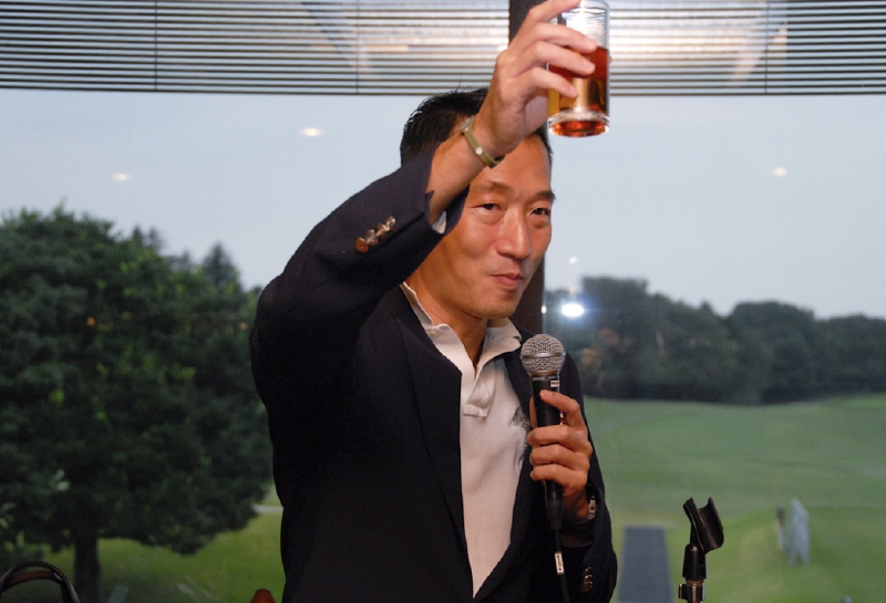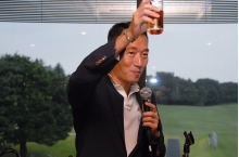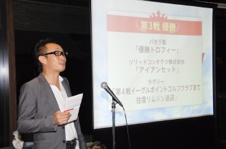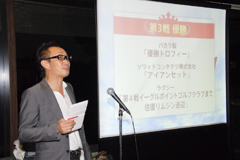 その後、ラッフル(チャリティ抽選会)が始まり、堀主知ロバ-トさんが3点の賞品を当てるというクジ運の強さを発揮。会場からは少々の嫉妬の声も? つづいて、ニアピン賞、ドラコン賞、ブ-ビ-賞、70位、60位……と名前が読み上げられます。40位で、第3戦前の年間総合ランキングで澤田さんと同率首位だったファウスト・ゴルフチ-ムメンバ-の井上盛夫さんの名前が呼ばれました。「悔しいね」とあくまで爽やかに話す井上さんですが、前回3位、年間総合ランキングでは首位という、この大会の優勝候補が早くもここで脱落したのです。会場は、誰が優勝したのか、誰が総合で首位に立ったのか、次第に熱気を帯びて行きます。
